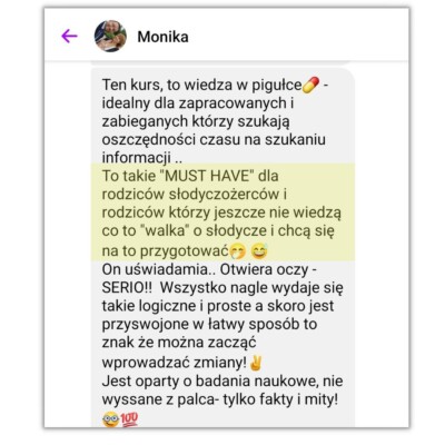 Zdobyłam MEGA wiedzę i doświadczenie, i na tej podstawie powstało istne słodkie kompendium — pakiet „Słodycze w diecie dziecka”, w którym krok po kroku wyjaśniam — dlaczego tak bardzo ciągnie nas (i nasze dzieci) do cukru, jak wprowadzać słodycze do diety dziecka, a także jak opanować i zmniejszyć słodką obsesję Twojego dziecka.